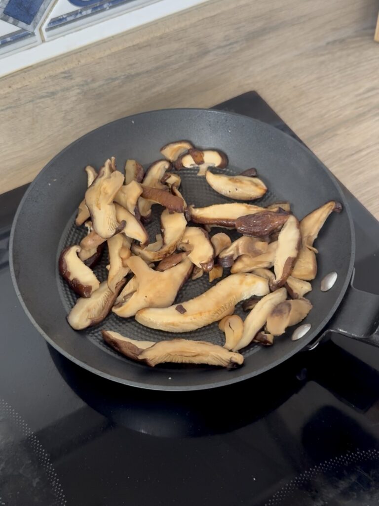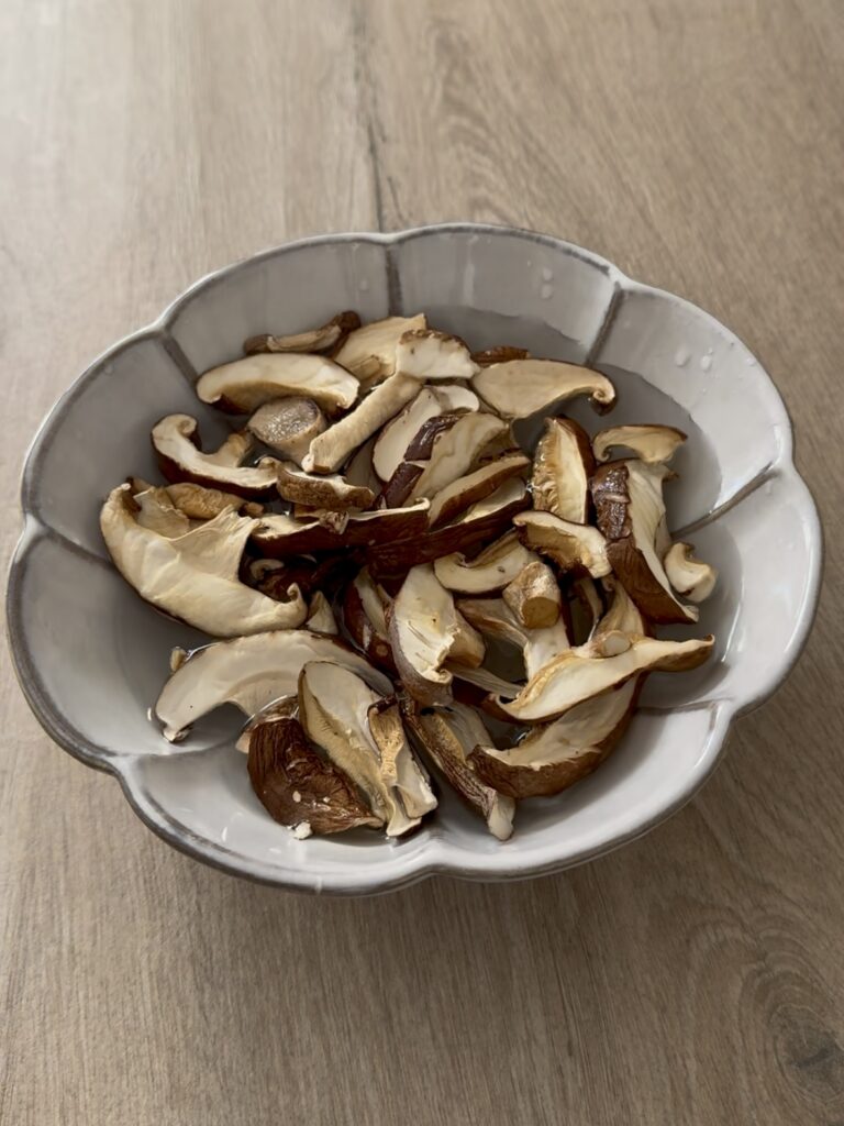 - Pon las setas shiitake a remojo en un bol con agua en el caso de que las tengas secas. Si tienes setas frescas sáltate este paso y córtalas directamente.