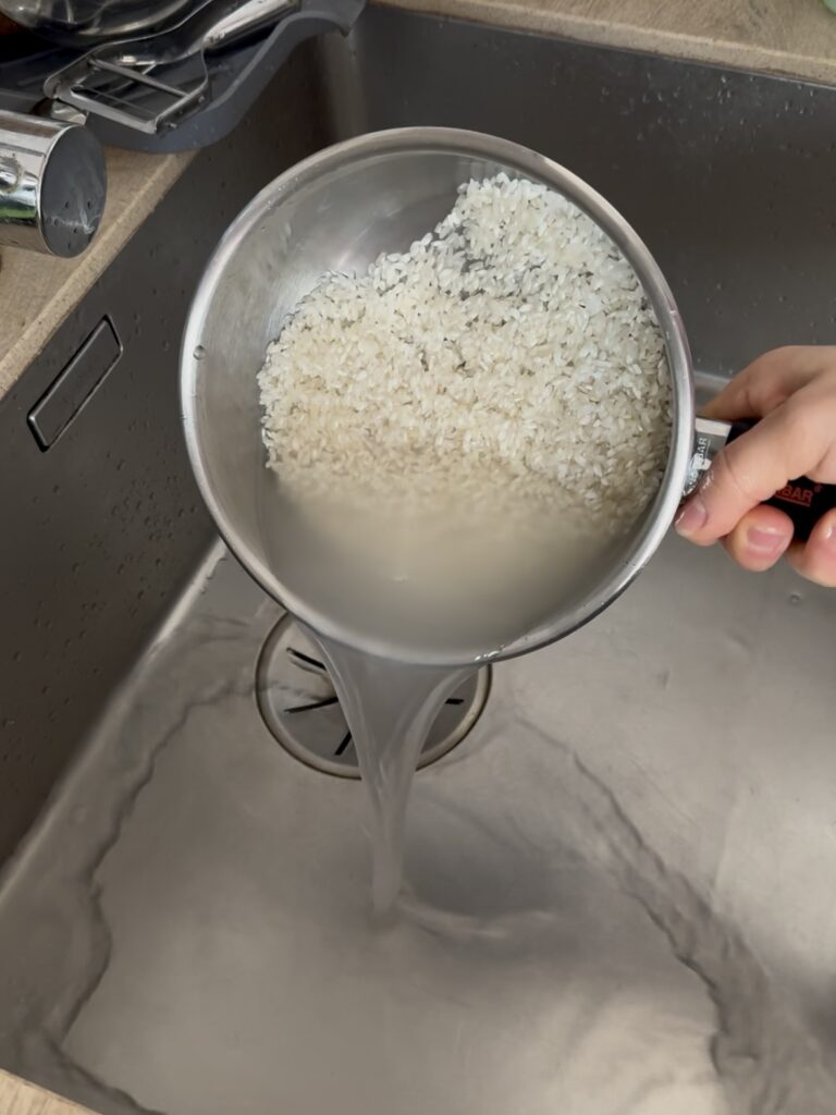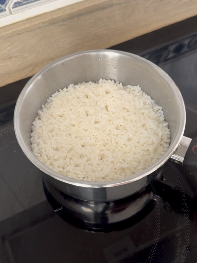 - Prepara el arroz: lava el arroz bajo el grifo cambiando el agua 3 o 4 veces. Después ponlo en el fuego con un vaso de agua y cuando arranque a hervir tápalo. Baja el fuego a fuego bajo y deja que cueza 12 minutos. Después, apártalo del fuego y déjalo tapado otros 15 minutos.