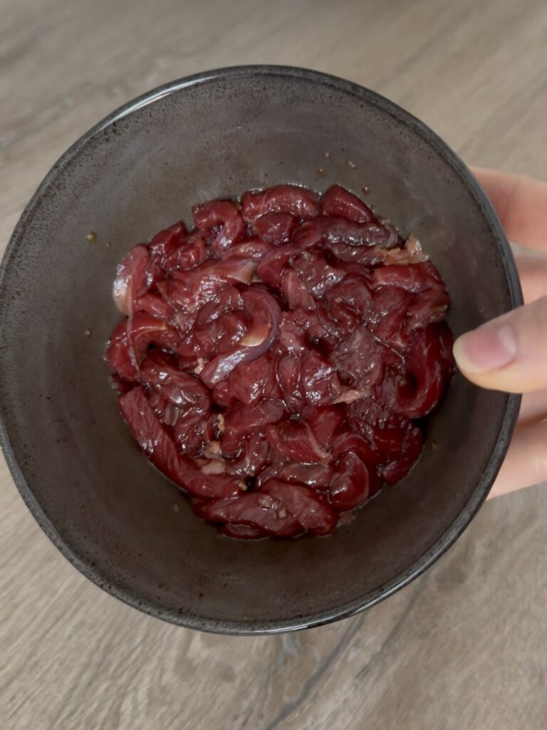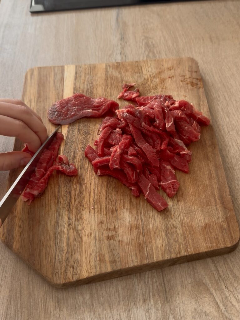 - Marina la carne: corta la carne en tiras y añádela a un bol. Añade los ingredientes del marinado , remueve bien y tapa con un film transparente. Reserva.