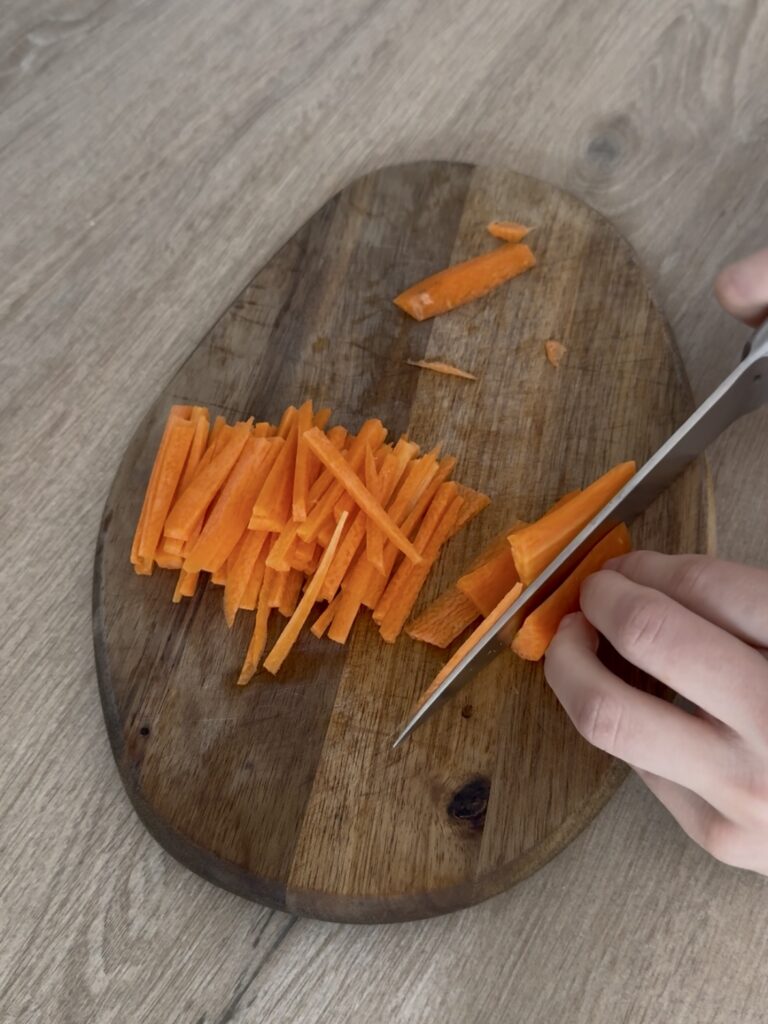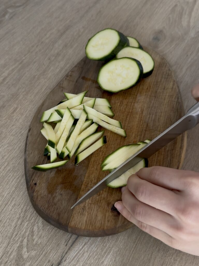 Mientras tanto, corta la zanahoria y el calabacín en juliana.