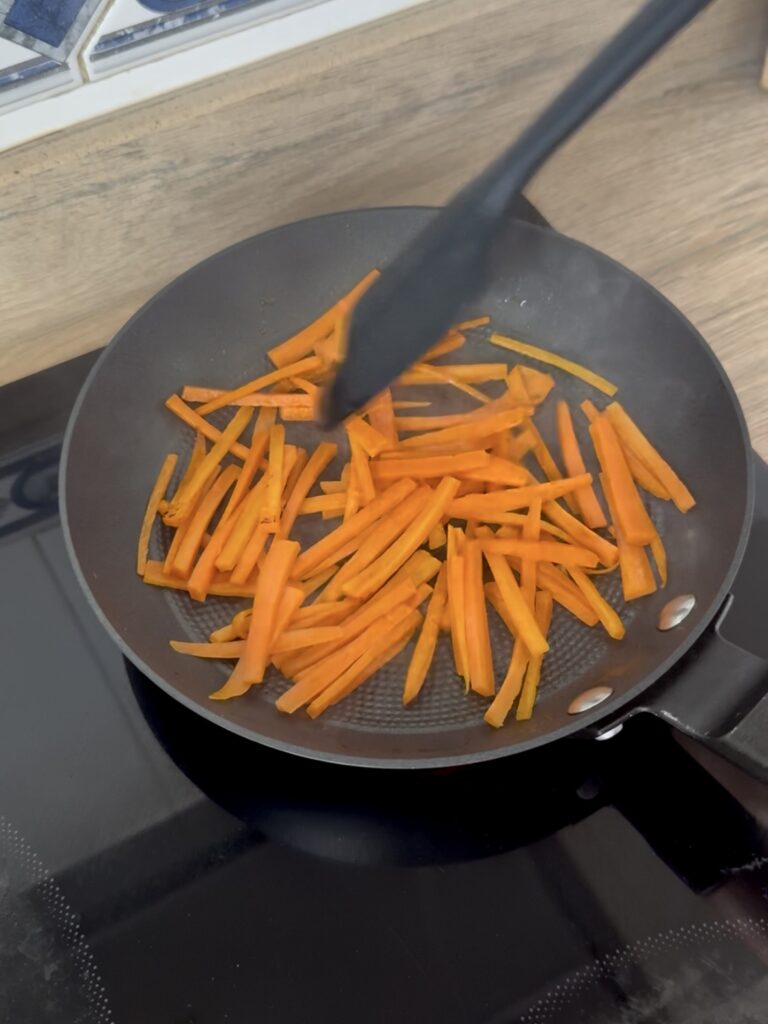 - Mientras tanto, corta la zanahoria y el calabacín en juliana.
