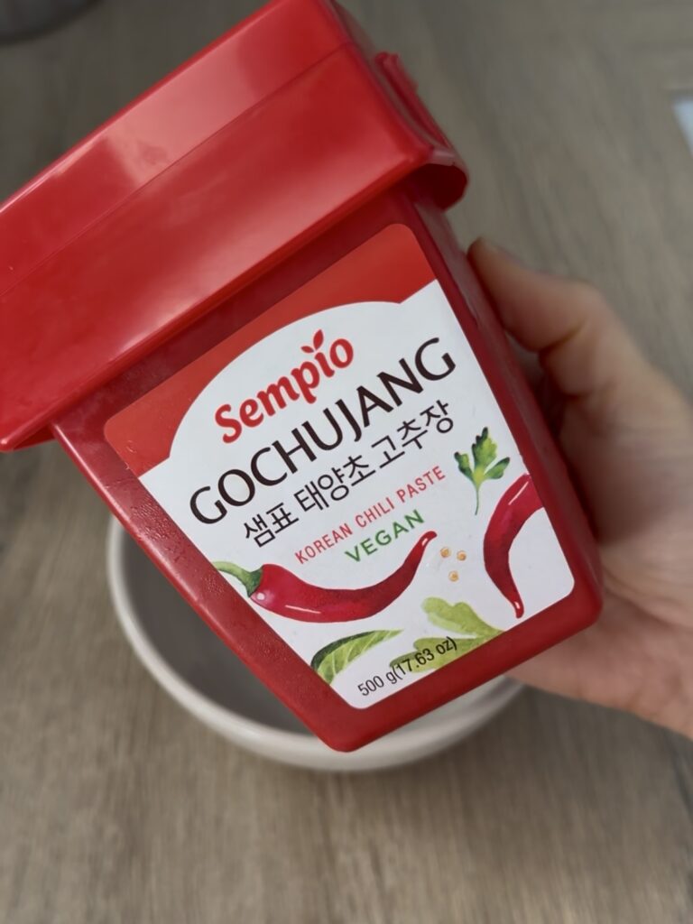 La salsa se hace con una base de pasta de chile gochujang, muy típica en la cocina coreana y tiene un sabor reconocible y muy especial.