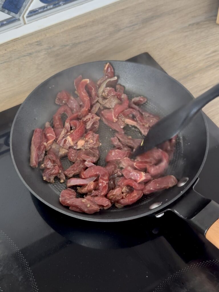 - Cocina la carne en la misma sartén, también a fuego fuerte.