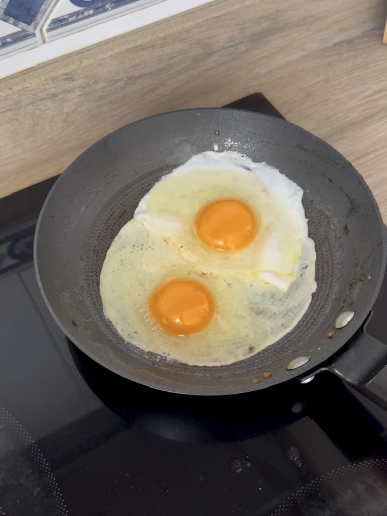 - Por último, cocina los huevos, que serán uno para cada plato. Puedes tapar la sartén para que se hagan bien por arriba.
