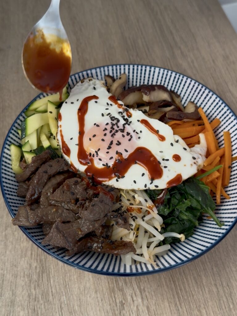 El Bibimbap coreano es básicamente un bol de arroz con un montón de cositas ricas encima: verduras salteadas, carne bien marinada, un huevo a la plancha y, por supuesto, la maravillosa salsa del Bibimbap, que le da un toque picante y dulce que hace único a este plato.