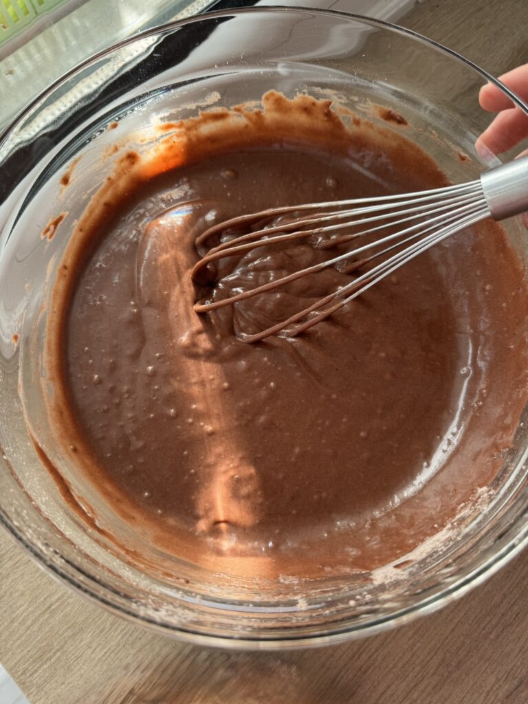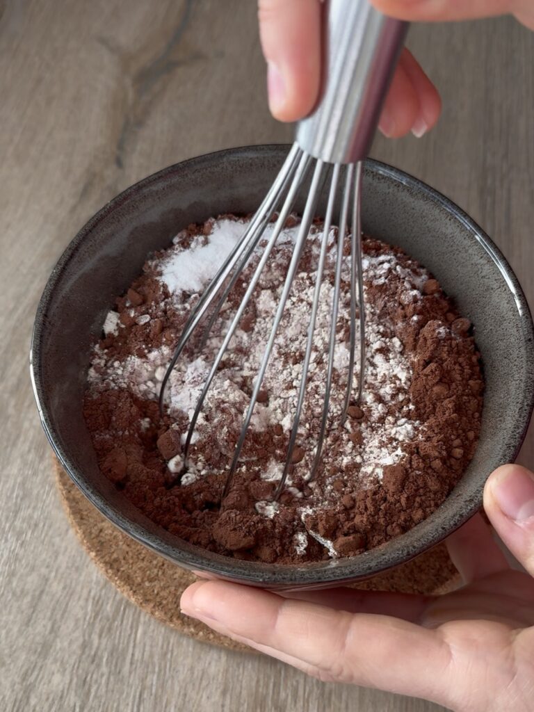 En un bol aparte, mezcla la harina con el cacao, los impulsores y la sal. Añádelos al bol principal tamizándolos a través de un colador y mezcla bien hasta que no quede harina seca.