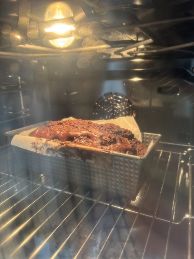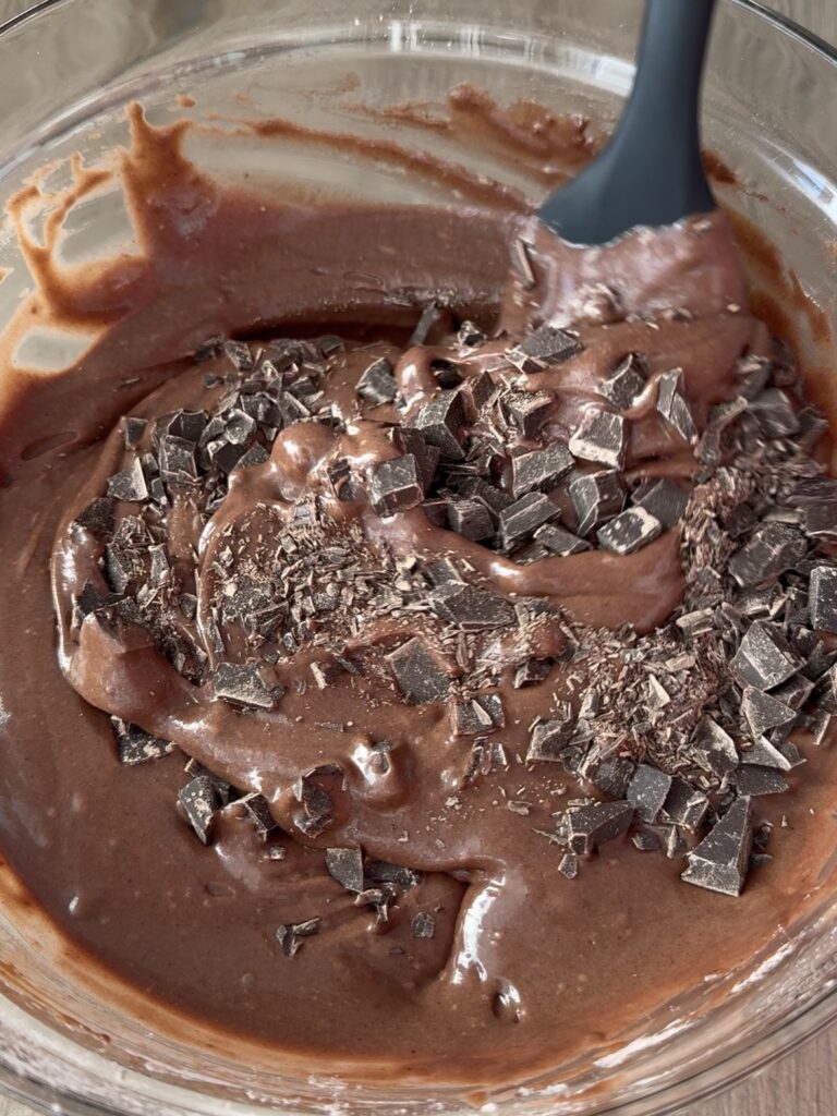 Añade la mezcla al molde y pon los trozos de chocolate reservados por encima.