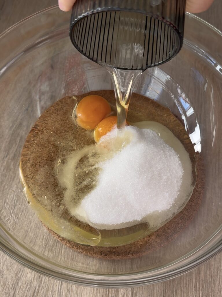 En un bol grande, añade los huevos, el azúcar y el aceite. Mezcla con la varilla hasta que esté bien integrado.