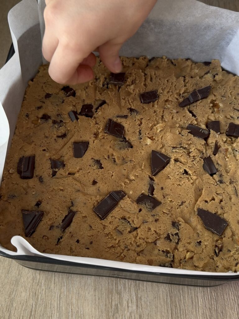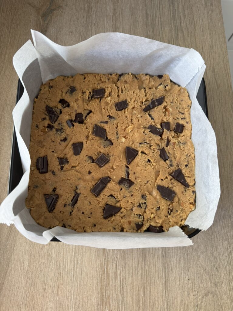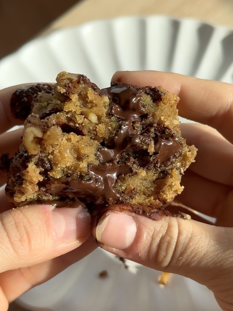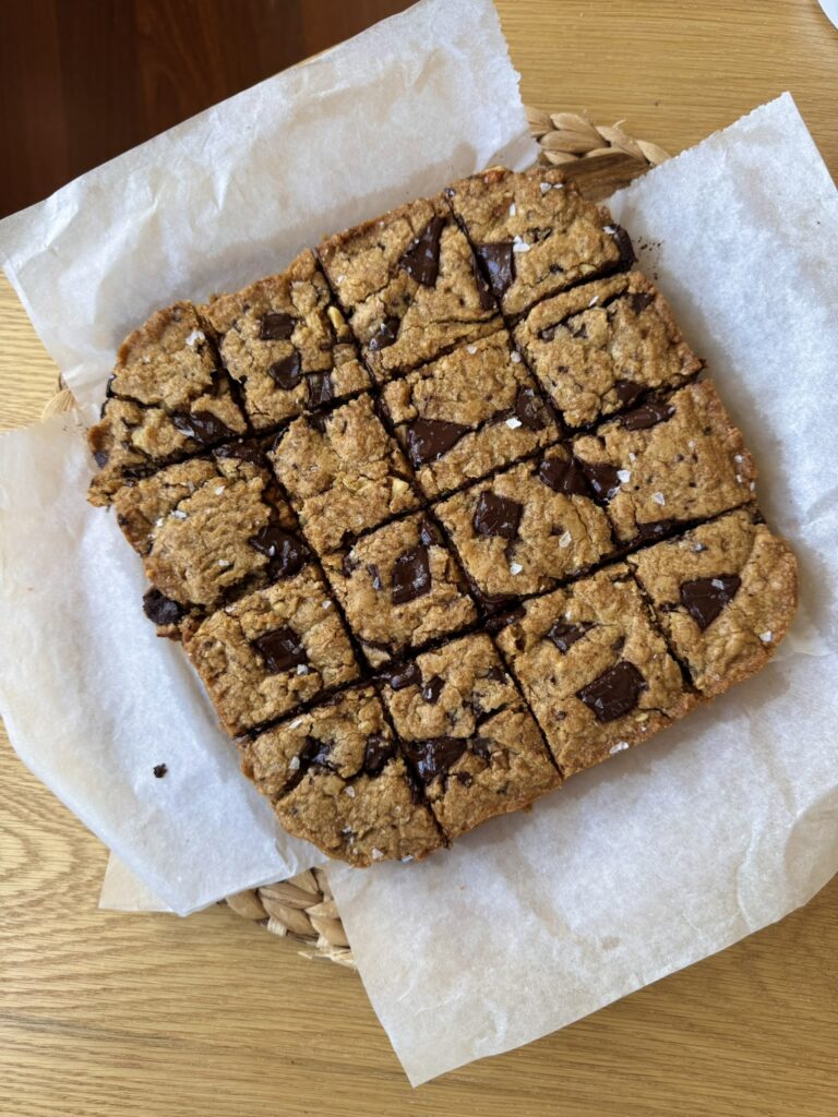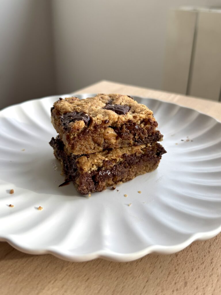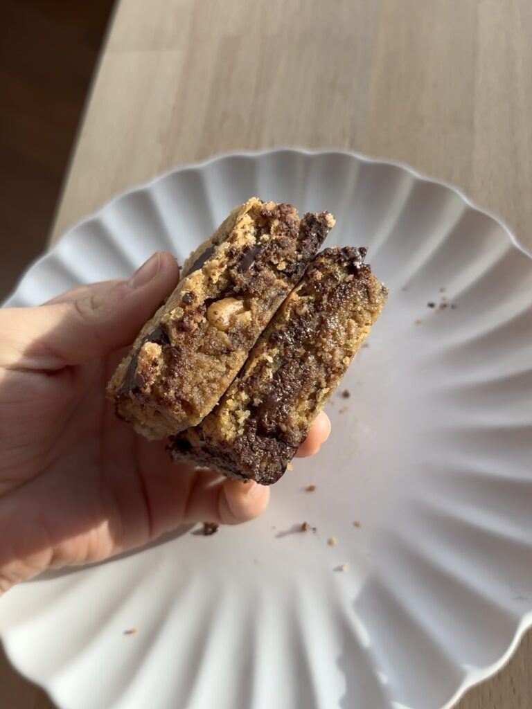 Es como una cookie pero en versión cuadradito y mucho más blando y jugoso. O sea, una locura. Y lo mejor es que es súper fácil de hacer y te resuelve un antojo en muy poco tiempo.
