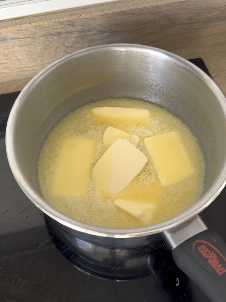Tuesta la mantequilla en un cazo a fuego medio, removiendo constantemente hasta que veas que está doradita. Puedes mirar aquí cómo se hace paso a paso.