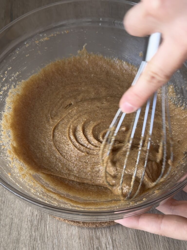 En otro bol, añade los azúcares y la mantequilla tostada. Mezcla ambos con las varillas hasta que el azúcar empiece a derretirse un poco.