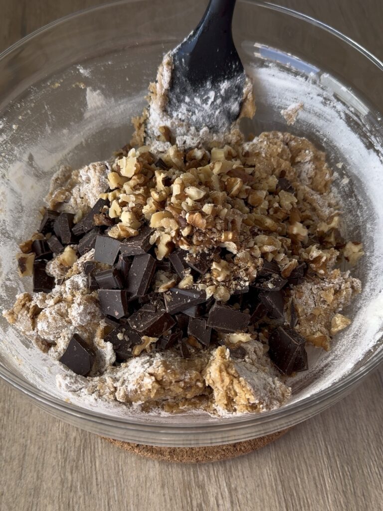 - Cuando esté casi integrada, añade el chocolate y las nueces y termina de integrarlo todo. Es importante que no mezcles de más.
