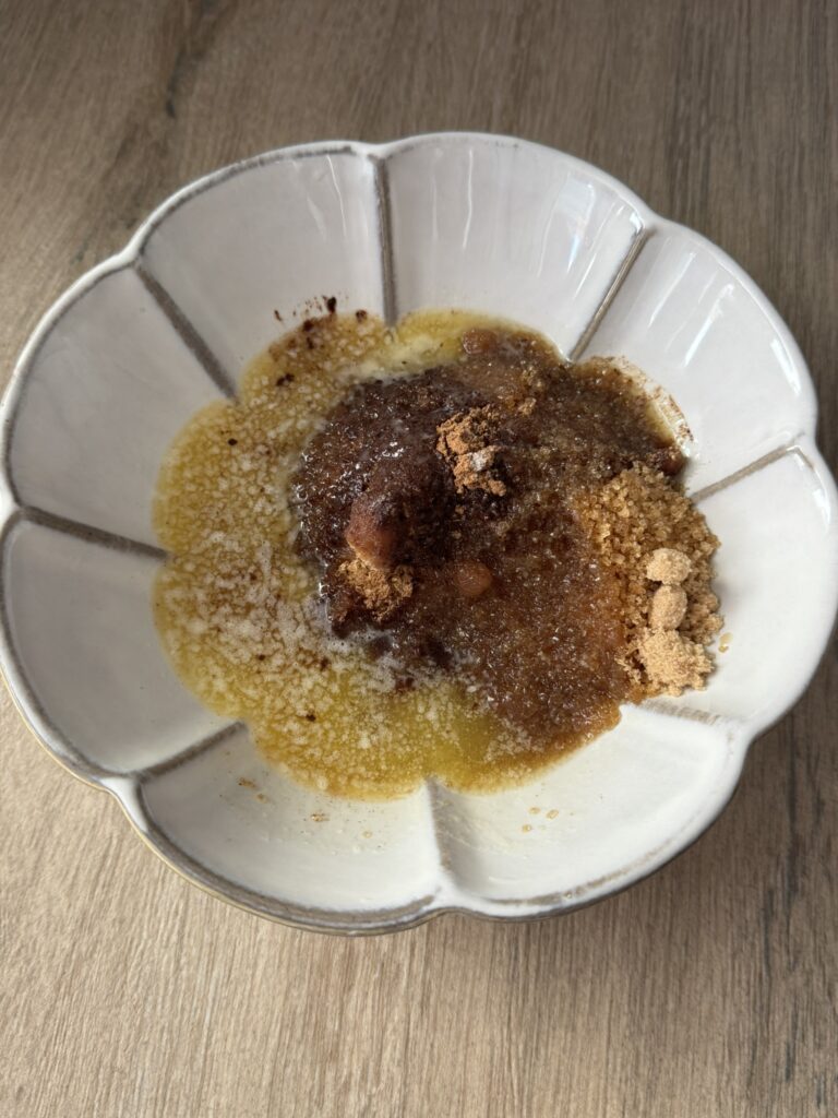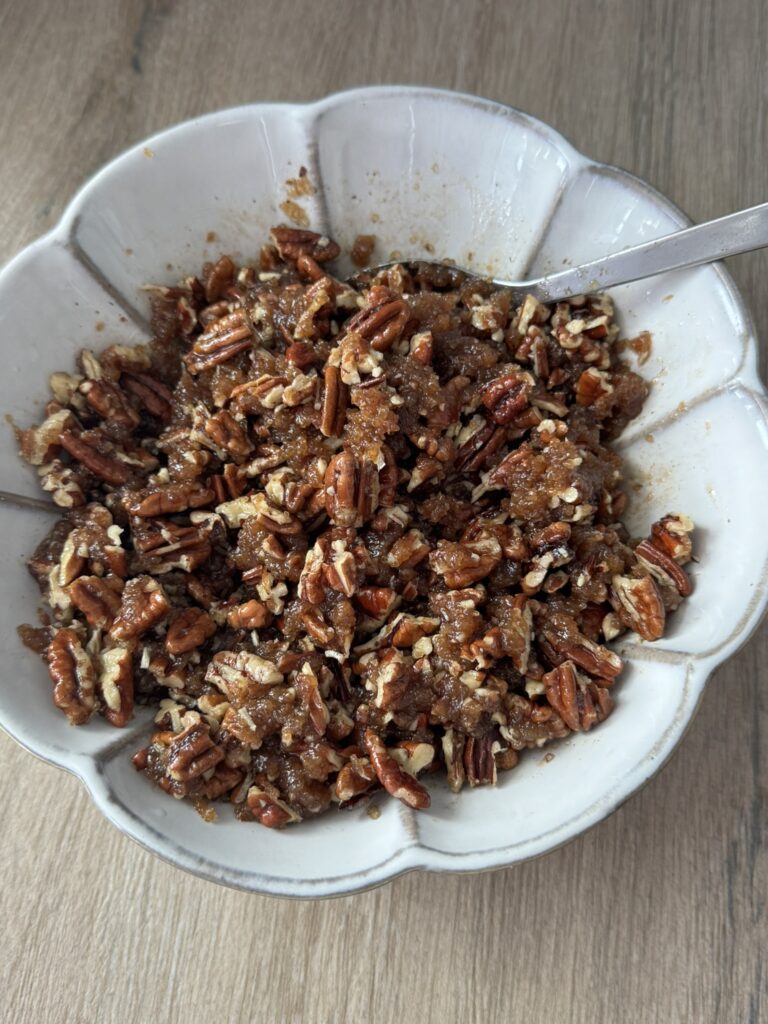 2. En un bol, añade el azúcar, la canela, la sal y la mantequilla fundida. Mezcla hasta integrar. Añade las nueces picadas e intégralas bien. Reserva.
