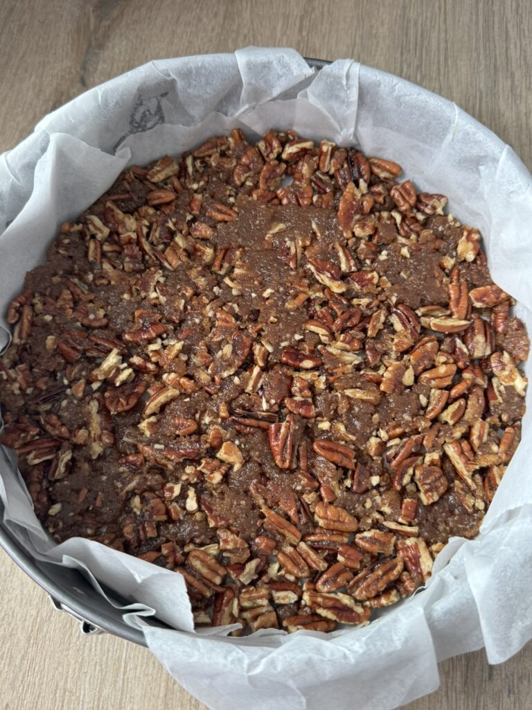 2. Cubre todo el fondo del molde con una capa del relleno de nueces. Usa aproximadamente la mitad del total de relleno.