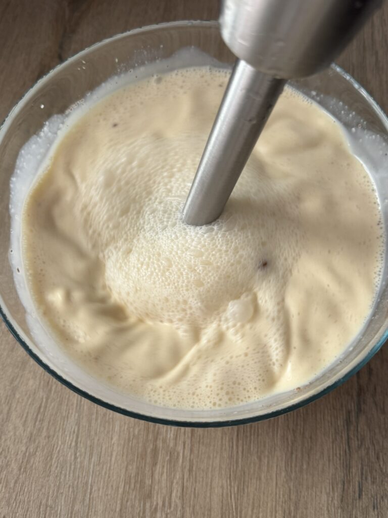 3. En otro bol más grande, añade todos los ingredientes para la crema. Bate bien con una batidora de mano hasta que tengas una mezcla homogénea. Reserva.