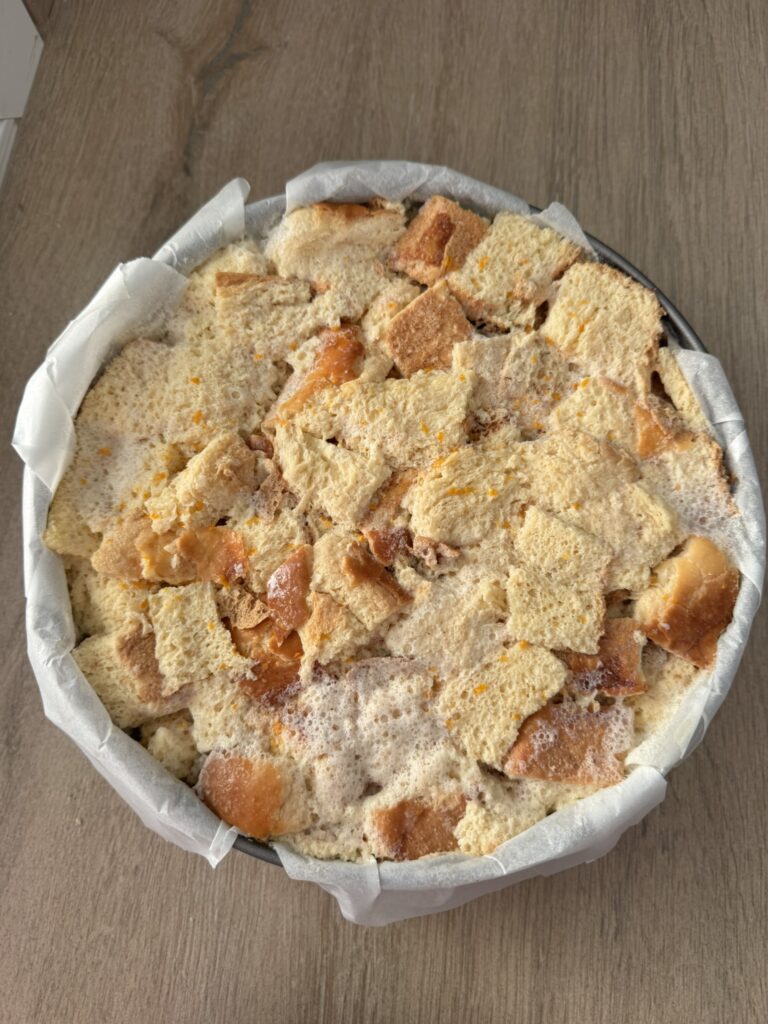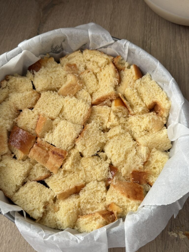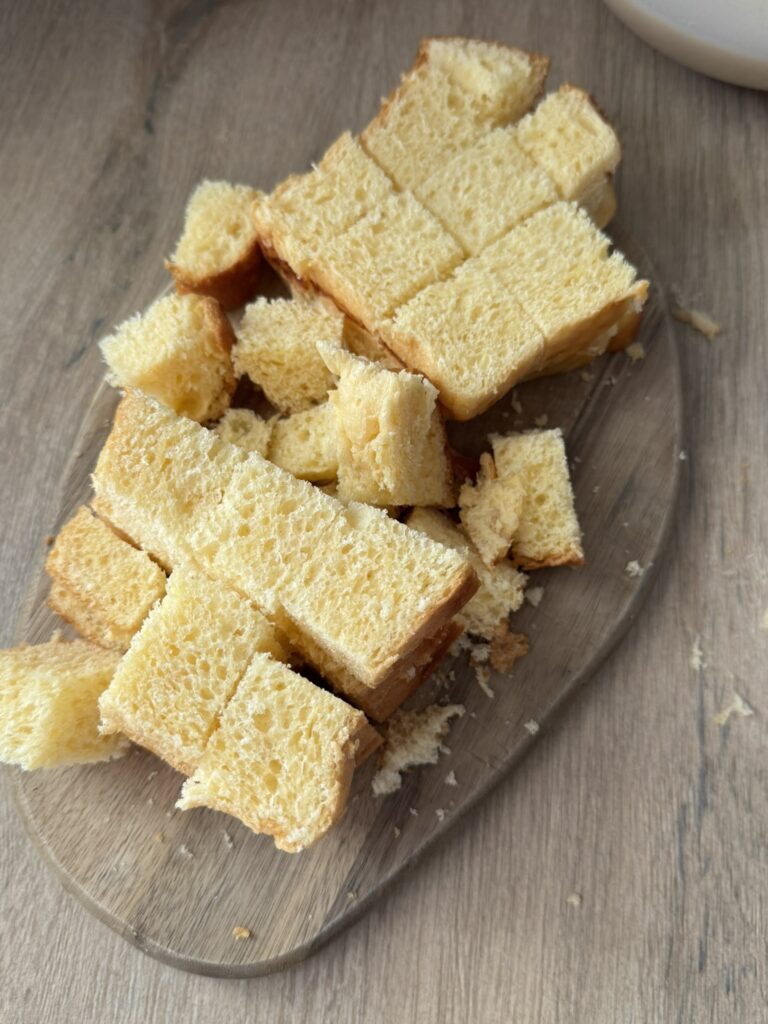 4. Corta el pan brioche en rebanadas, y estas rebanadas en cubitos de unos 2-3cm de ancho.