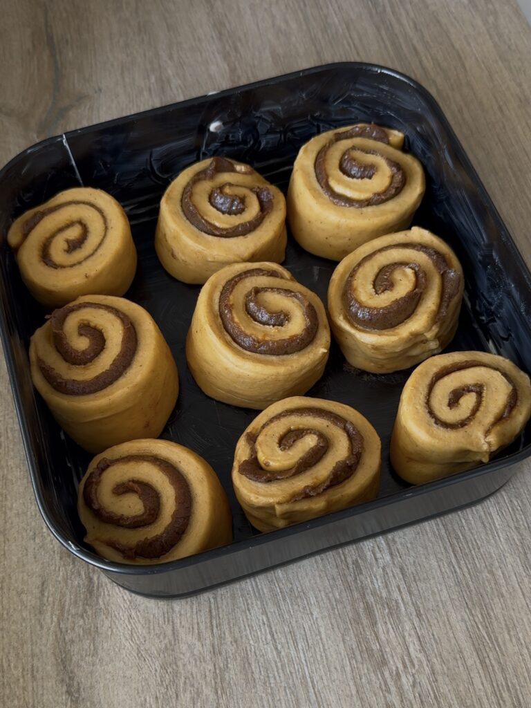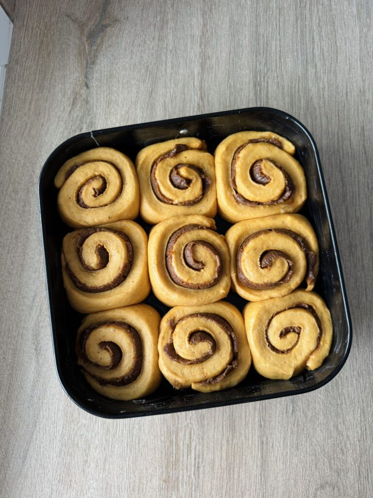 Engrasa un molde cuadrado (de 23×23 aprox.) con mantequilla y transfiere los rollitos al molde, colocándolos juntos con la espiral hacia arriba.