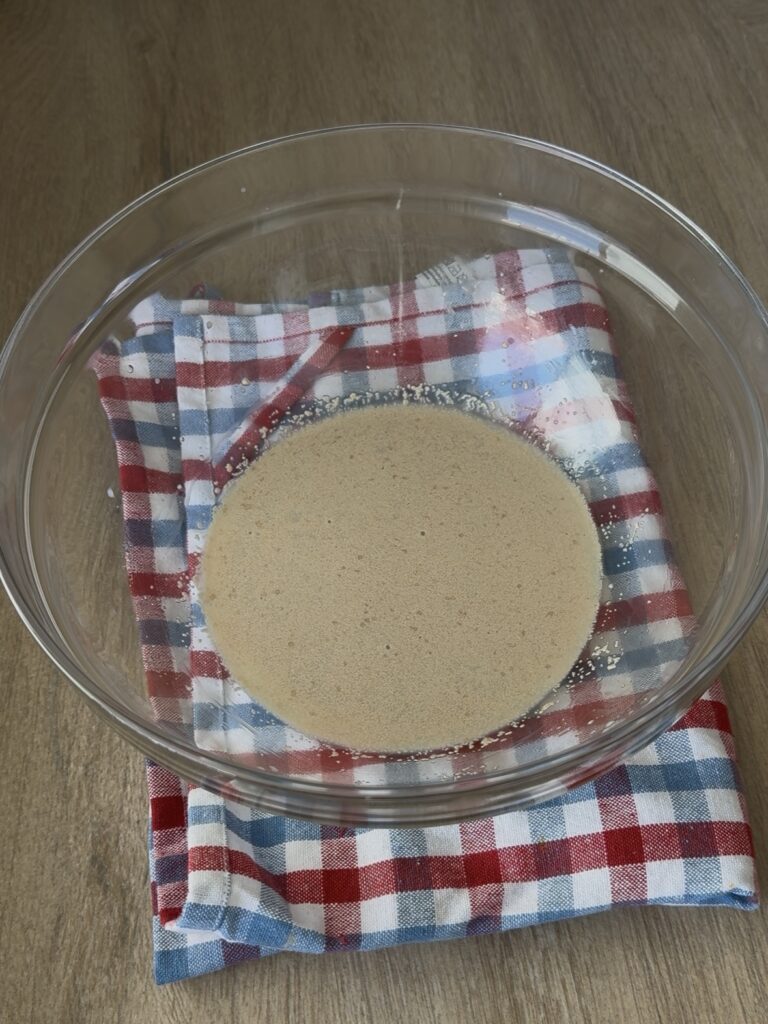 Espolvorea la levadura, disuélvela y deja que repose hasta que esté espumosa, unos 5 minutos.
