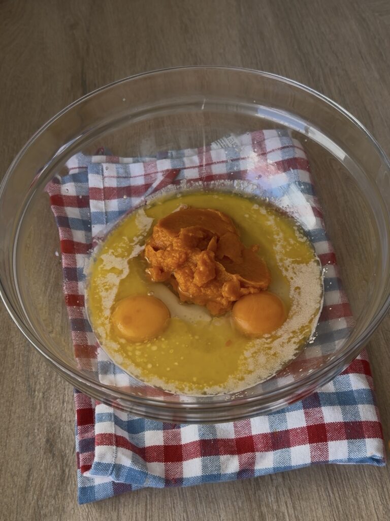 Pasados los 5 minutos, añade la mantequilla fundida, el huevo, la yema y la calabaza. Remueve bien con unas varillas hasta que esté todo integrado.