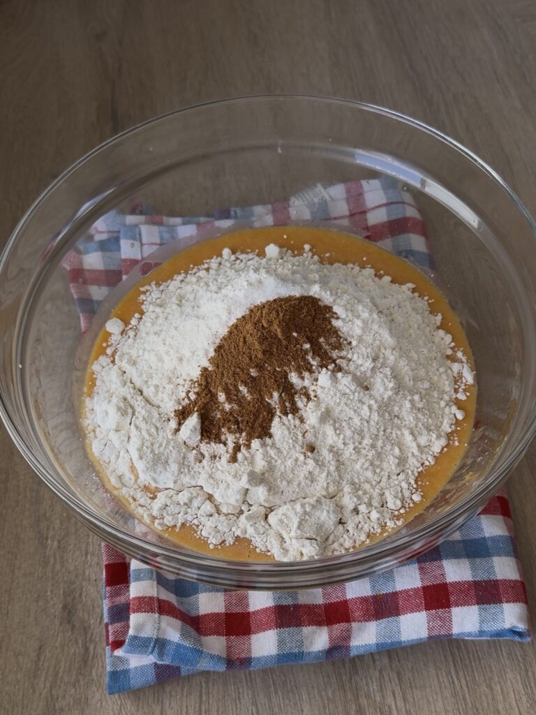 - Pasados los 5 minutos, añade la mantequilla fundida, el huevo, la yema y la calabaza. Remueve bien con unas varillas hasta que esté todo integrado.