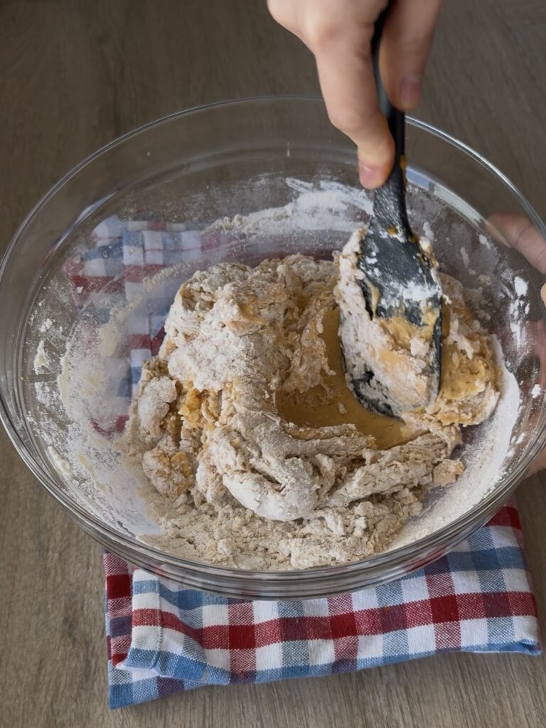 Incorpora la harina, la sal y las especias y mezcla con una espátula hasta que empiece a formarse una masa.