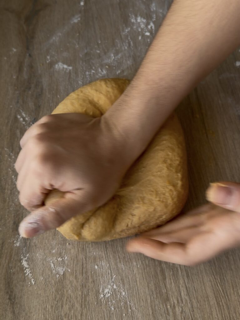 Después pásalo a una superficie enharinada y amasa durante 10 minutos hasta tener una bola lisita y que no se pegue. Si ves que se pega mucho puedes ir añadiendo hasta 3 cucharadas más de harina, siempre de una en una, pero no te recomiendo pasarte para que los rollitos queden bien esponjosos.