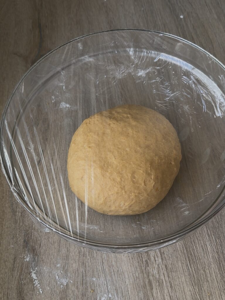 - Cuando tengas la bola, ponla en un bol engrasado y tápala con un film y un trapo de cocina. Deja reposar entre 1 hora y 1 hora y media, hasta que doble su tamaño.