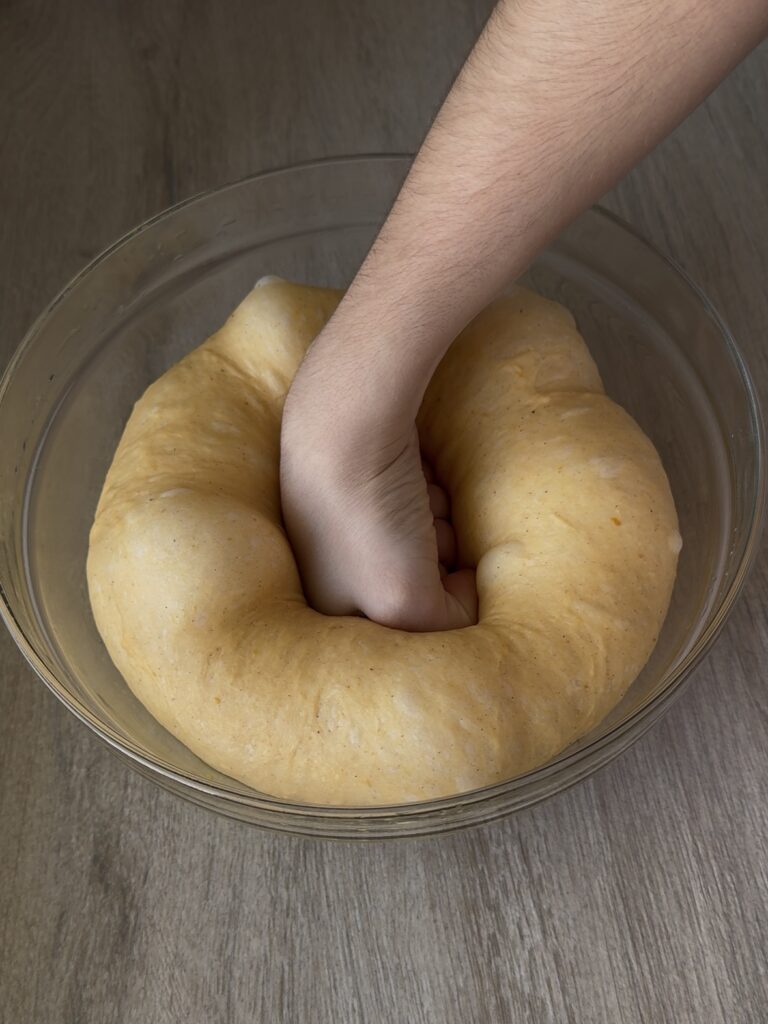 - Cuando la masa haya doblado su tamaño, quítale el aire y vuélcala en la superficie de trabajo.