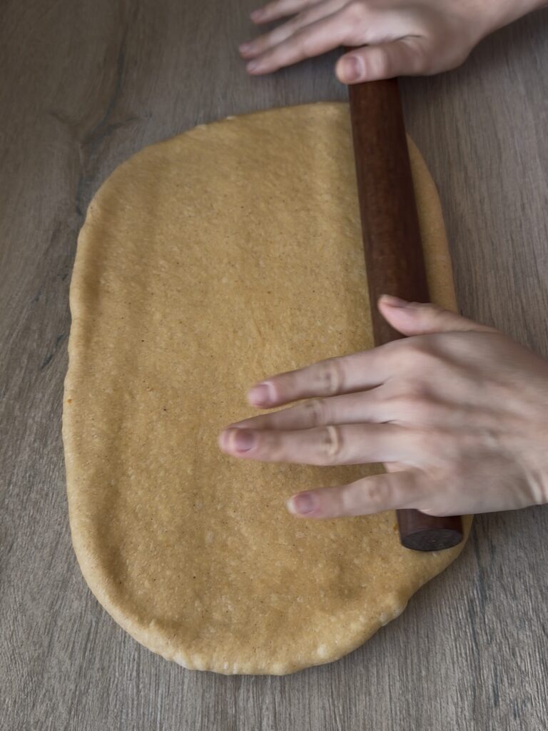 - Extiende la masa con un rodillo hasta obtener un rectángulo de 25x35cm aproximadamente.