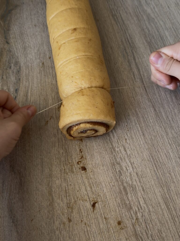 - Con ayuda de un hilo dental o un cuchillo afilado, corta el rollo de masa en 9 trozos del mismo tamaño.