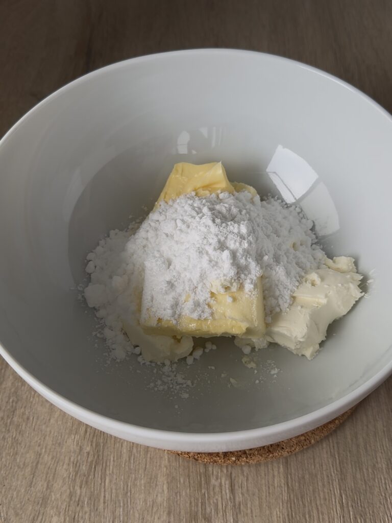 - Mientras los Rolls de Calabaza se hornean, prepara el frosting en un bol. Añade el queso, el azúcar glas y la mantequilla.