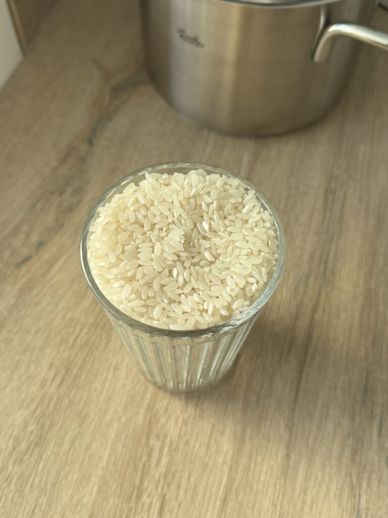 Añade la misma cantidad en volumen de agua (en este caso, un vaso) y ponlo a fuego alto.