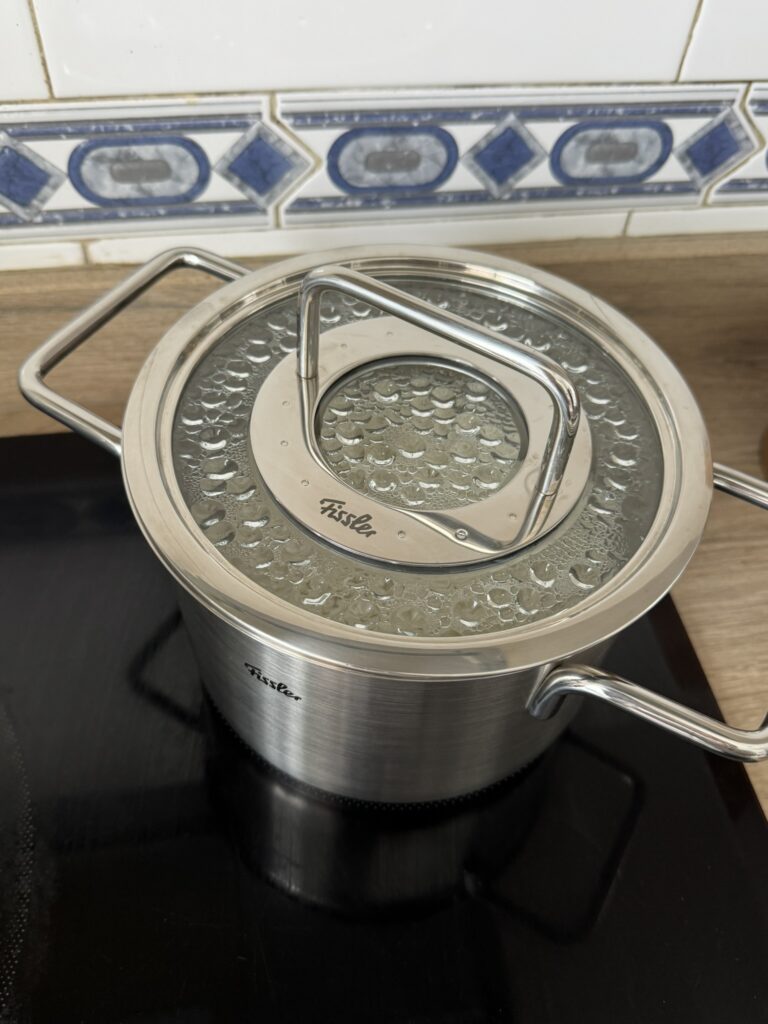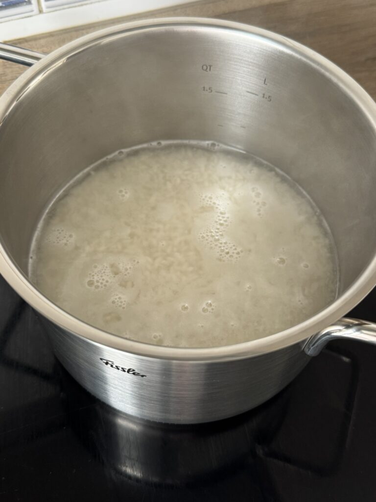 Cuando empiece a hervir suavemente (saldrán unas burbujitas pequeñas en el centro) tapa la olla con una tapa que encaje perfectamente, baja el fuego al mínimo (yo lo pongo al 1 de 9) y déjalo 12 minutos.