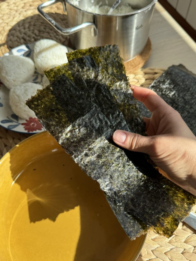Cuando tengas todas las bolitas, corta el alga nori en tiras lo suficientemente largas como para envolver el onigiri.