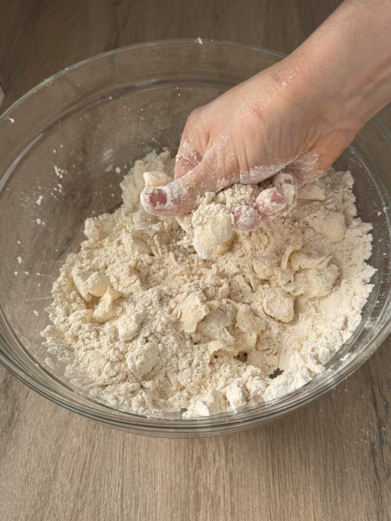 Añade la mantequilla, fría y cortada en cubitos sobre la harina. Con los dedos, frota los cubitos de mantequilla con la harina para irlos deshaciendo y mezclando, hasta que tengas una especie de tierra o arenilla.