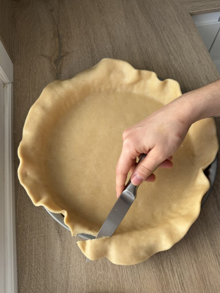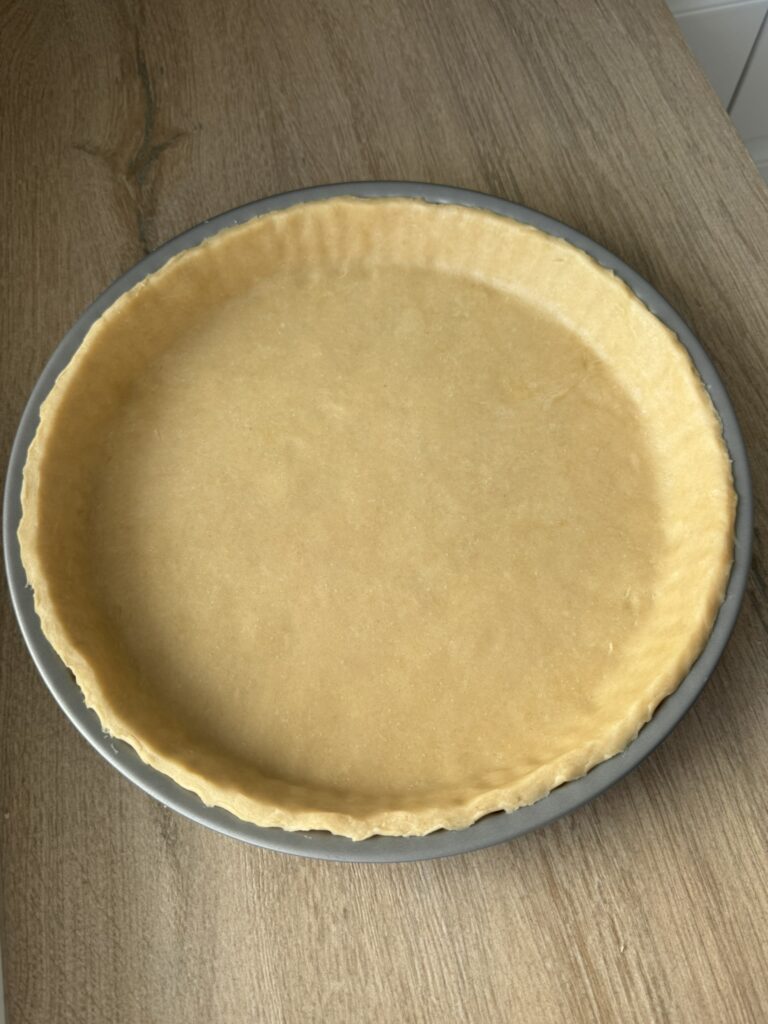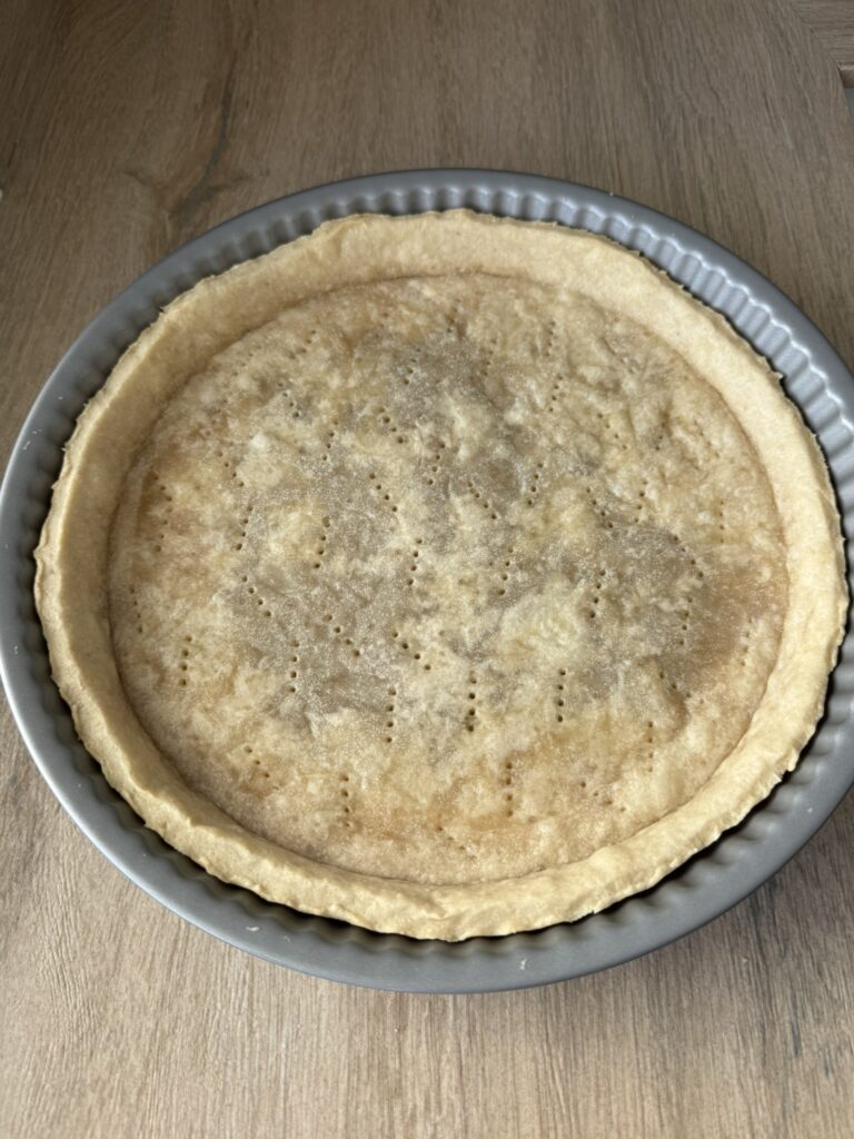 Pasado el tiempo, estírala con un rodillo hasta que tenga el tamaño del molde (unos 2-3 mm de grosor). Recorta el borde sobrante con un cuchillo y pincha toda la base de la masa con un tenedor.