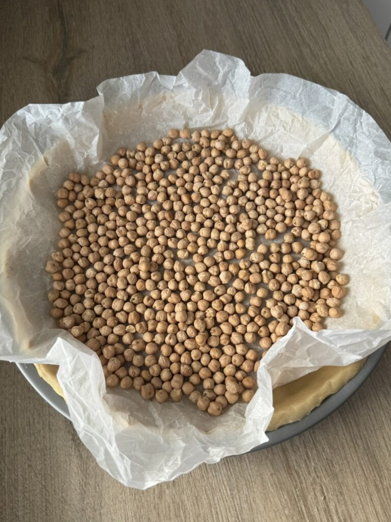 Coloca un papel de horno y algo de peso encima (pueden ser legumbres o arroz) y hornea la masa durante 15 minutos a 180ªC.