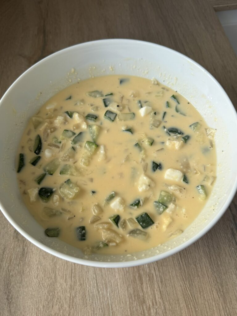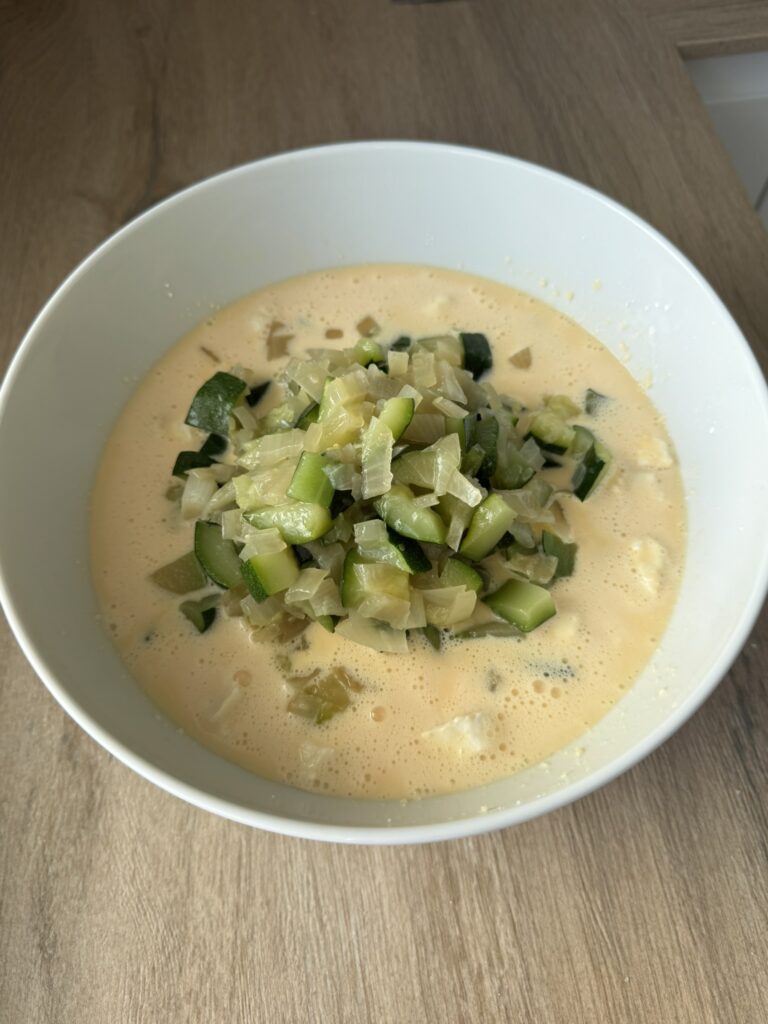 Añade el queso de cabra picado y el calabacín y cebolla a la mezcla anterior. Remueve para mezclar. Rectifica de sal y pimienta si es necesario.