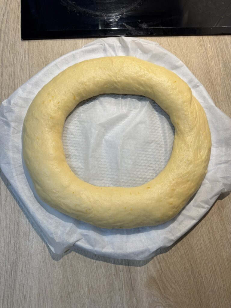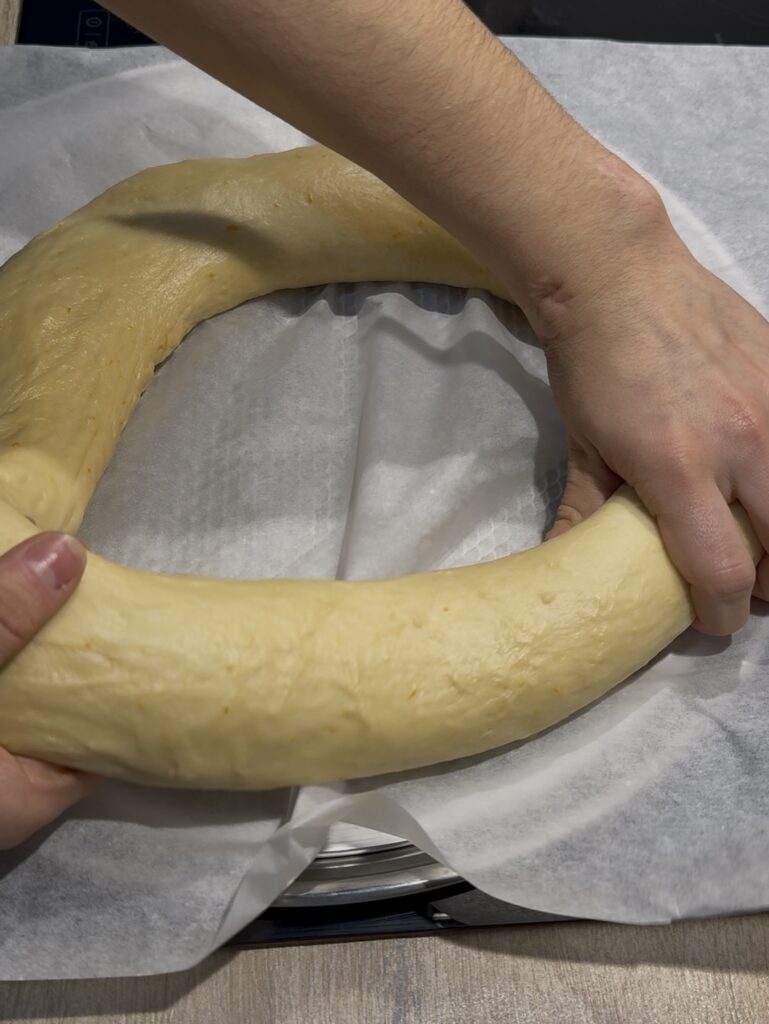 Pásalo a una bandeja con papel vegetal y termina de darle forma. Te aconsejo que dejes un agujero bastante grande para que no se cierre mucho al hornear.