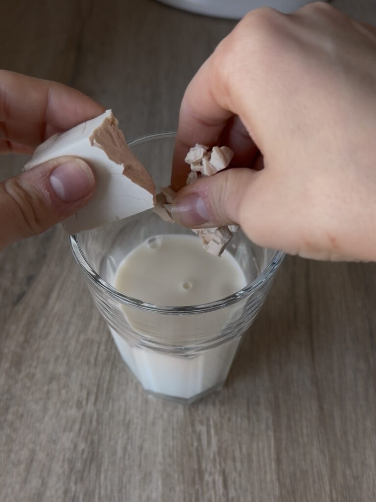 Añade la levadura a la leche, troceándola un poco con los dedos, y disuélvela con una cuchara hasta que no queden grumos.