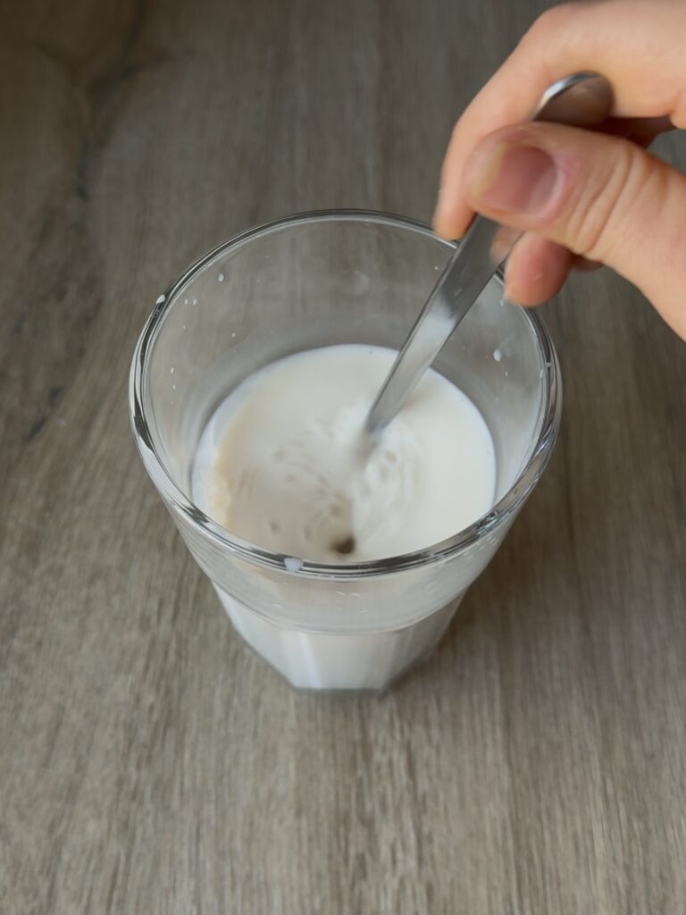 - Calienta la leche en el microondas durante 45 segundos – 1 minuto, hasta que esté tibia.