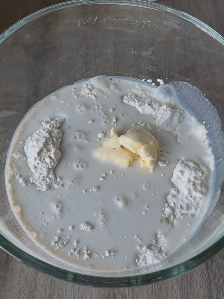 En el hueco añade el resto de ingredientes: la mezcla de leche con levadura, los huevos, la mantequilla, las ralladuras, el aroma y el azúcar.