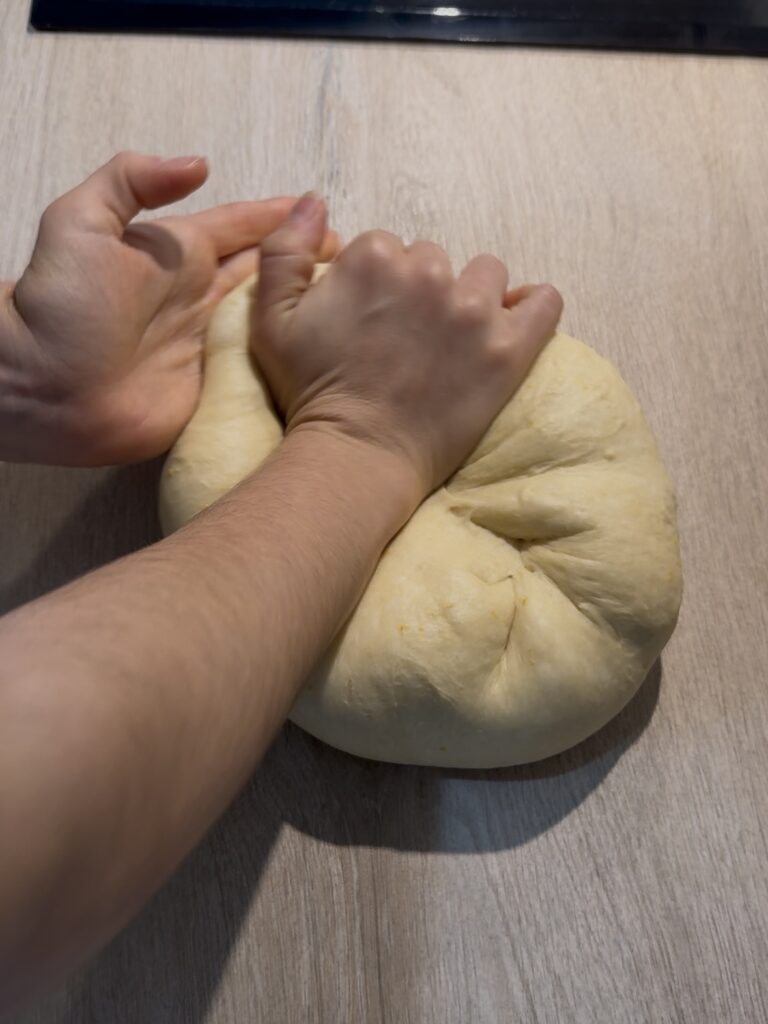 – Amasa durante 5 minutos aprox. hasta que ya se haya formado una masa. Puedes añadir un poco de harina si ves que está muy pegajosa (pero no más de 2 cucharadas en total). También puedes untarte las manos con aceite para que sea más fácil.