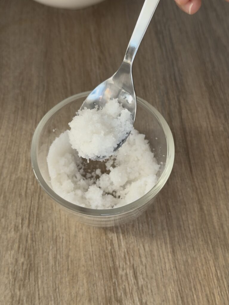 Humedece las 3 cucharadas de azúcar con 1 cucharadita del aroma de azahar o agua, hasta que tenga una textura de arena mojada.
