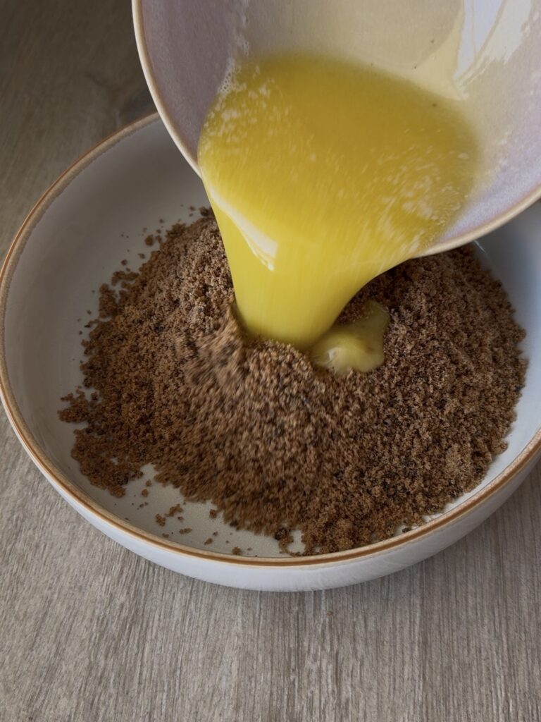 - Mezcla la mantequilla y las galletas trituradas hasta que quede una textura tipo «arena mojada».