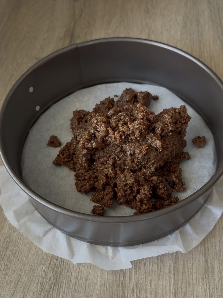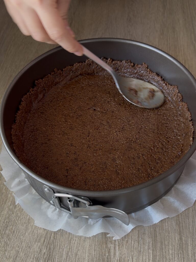 - Añade la mezcla de galletas y mantequilla y aplasta con una cuchara o vaso hasta tener una base sólida.