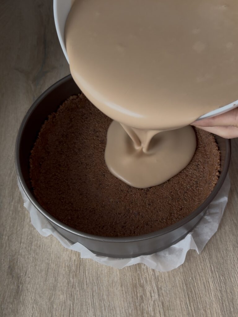 - Añade la mezcla al molde con la base de galletas, vertiéndola encima de una cuchara para no agrietar la base.