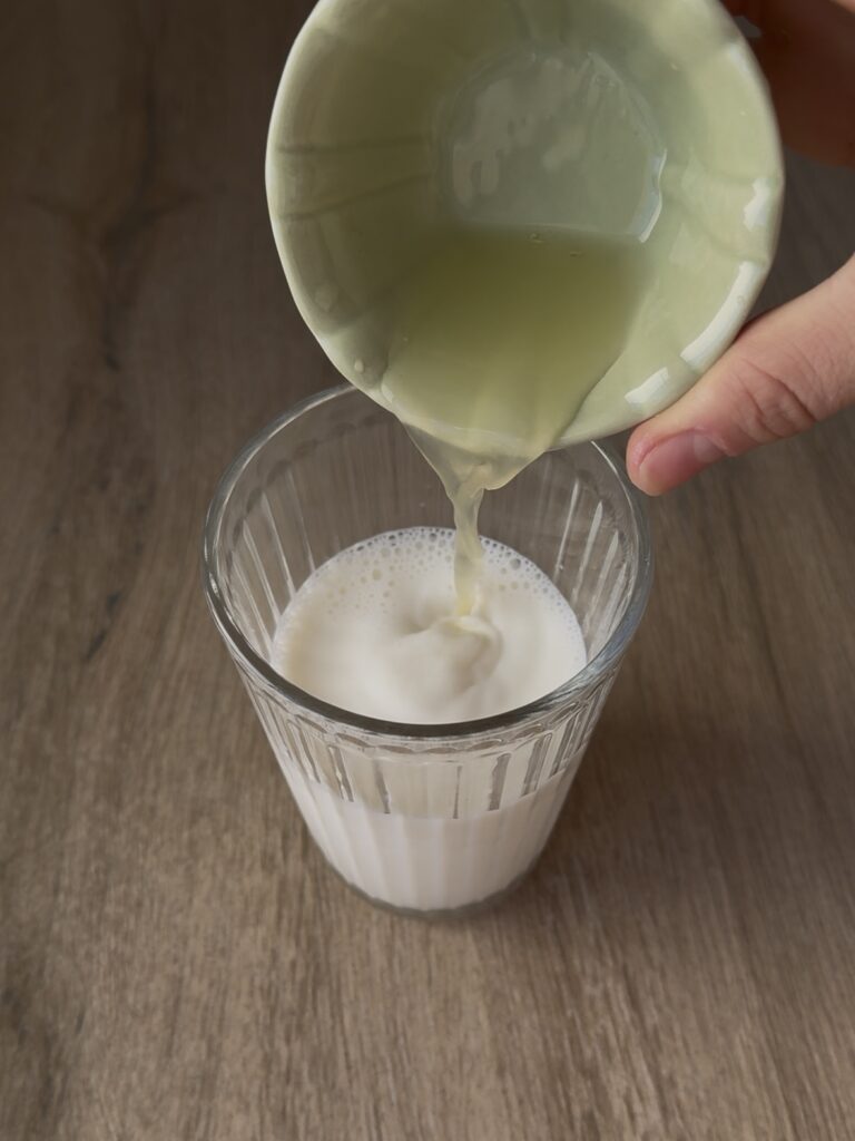 1. Pon la leche en un vaso y, si está fría de la nevera, témplala unos segundos en el microondas. Añade el zumo de limón. Remueve un poco con una cuchara.  Reserva mientras preparas el resto.