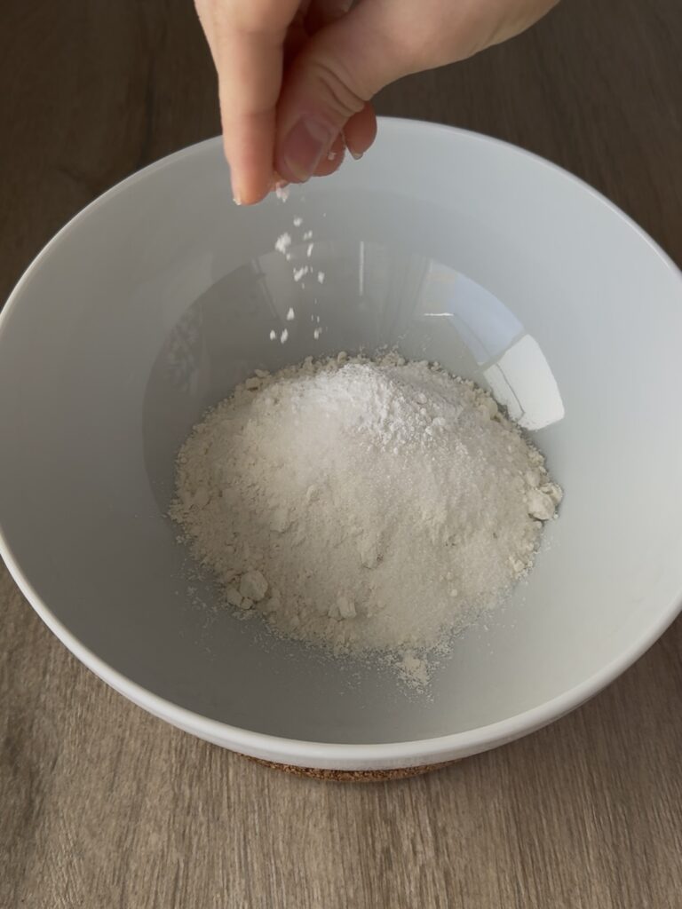 3. En un bol grande, añade la harina, el azúcar, el bicarbonato, el polvo de hornear y la sal. Remueve un poco con una cuchara para mezclarlo todo.