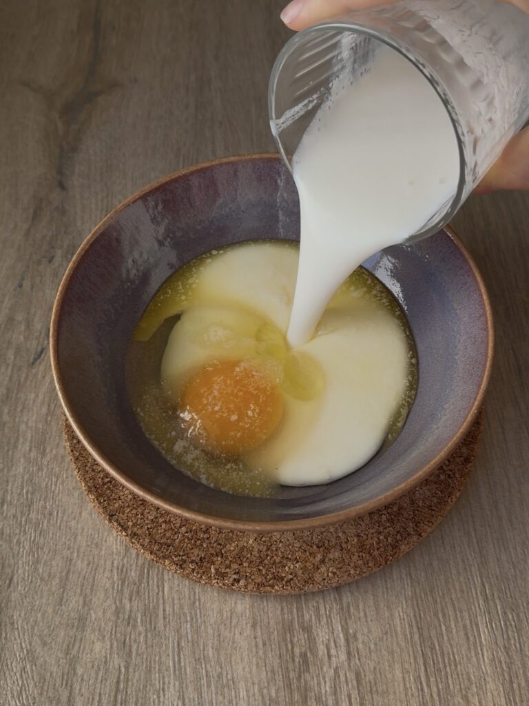 4. En un bol más pequeño, añade el huevo, la mantequilla fundida y la mezcla de leche y limón. Remueve con unas varillas hasta integrar.